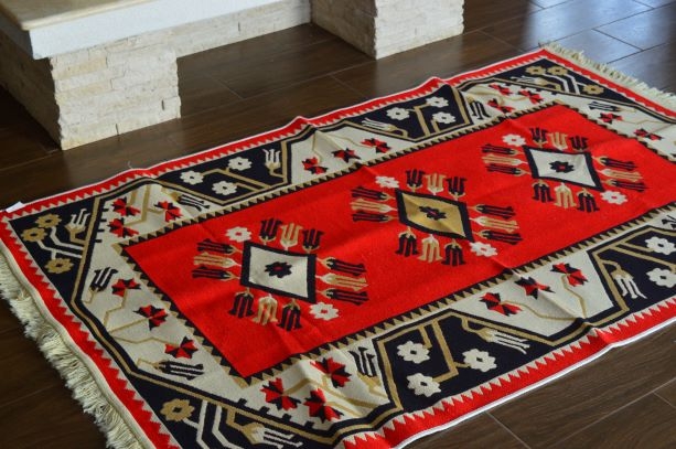 Covor din bumbac,roșu și albastru, cu romburi