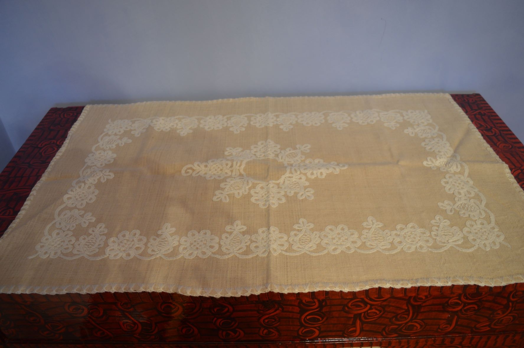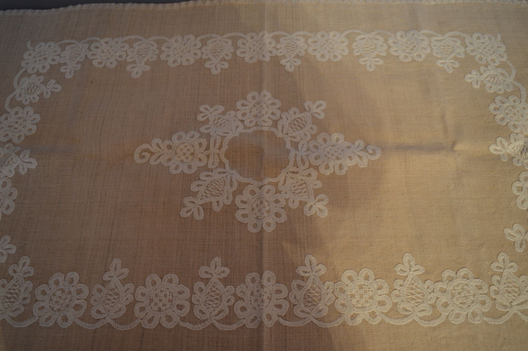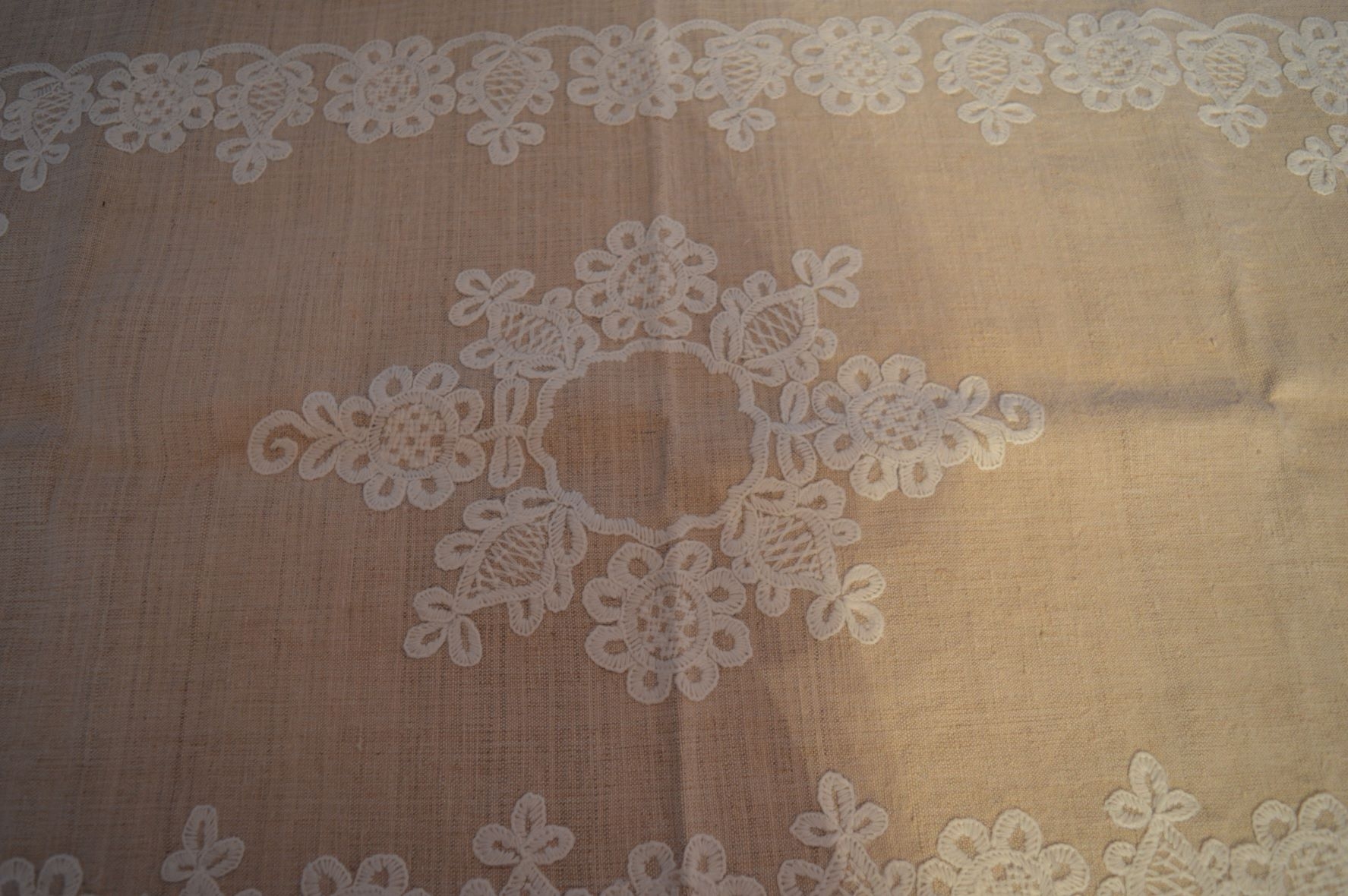 Față de masă, cusut manual cu trandafir, alb